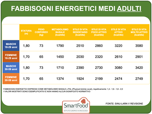 Osservando i fabbisogni energetici medi in età adulta e negli over 60, nelle tabelle di seguito, si nota come la diminuzione dei valori del metabolismo, determini una riduzione del dispendio energetico totale. La differenza tra uomo e donna, a parità di peso e altezza, è sempre determinata da una differente composizione corporea, generalmente l’uomo, infatti, ha una quota maggiore di massa muscolare.