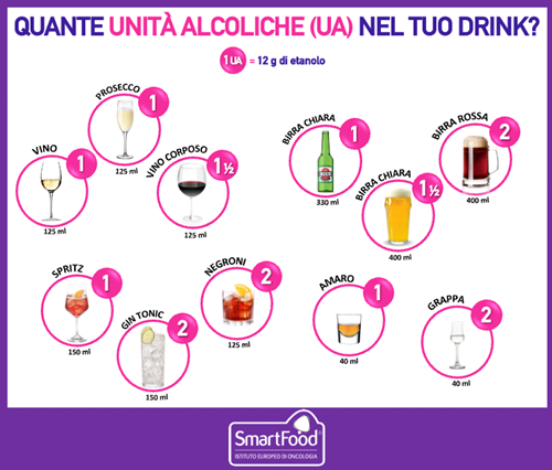 Tuttavia, se proprio si desiderasse assumerne comunque, il WCRF suggerisce di farlo seguendo le linee guida del proprio paese. Nel nostro caso, facciamo riferimento alle “Linee guida per una sana alimentazione italiana” che suggeriscono di non consumare più di 2 unità alcoliche al giorno per l’uomo adulto e più di 1 per donne adulte e anziani, di entrambi i sessi.