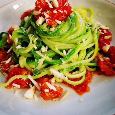 Questo primo piatto, adatto alle calde serate estive, vede come protagonista le zucchine, vegetali molto ricchi di acqua, ma anche fonti di vitamina C e folati. Per preservare il contenuto di queste sostanze, è opportuno consumare le zucchine crude oppure cuocerle molto brevemente, come in questa ricetta. Tra i minerali, risalta il potassio, il cui corretto apporto alimentare è associato alla riduzione della pressione, negli ipertesi.