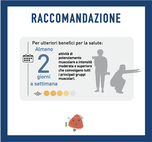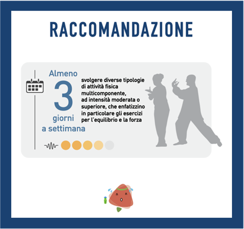 Secondo l’OMS, gli adulti over 65 dovrebbero svolgere almeno tra i 150 e i 300 minuti alla settimana di attività fisica aerobica moderata o tra i 75 e 150 minuti di attività fisica aerobica vigorosa o una combinazione delle due. Raccomanda, inoltre, di associare esercizi di rafforzamento muscolare, 2 o più volte a settimana, ed esercizi per il miglioramento dell’equilibrio per 3 o più giorni a settimana.