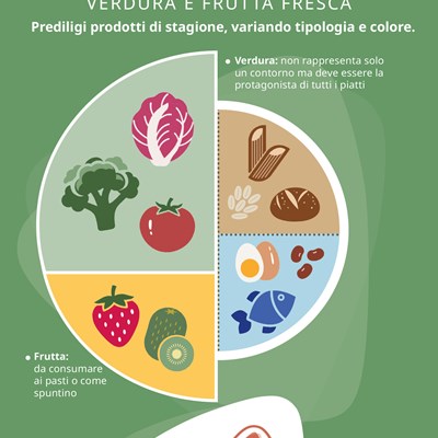 Il piatto sano rappresenta il modello di alimentazione sana per eccellenza. Questa grafica, che non esclude alcun gruppo alimentare, esemplifica come dovrebbero essere composti i pasti principali della giornata. I 2/3 del piatto sono rappresentati da alimenti di origine vegetale (verdure e ortaggi, cereali integrali e frutta), frutta e verdura ne costituiscono la metà e il restante spicchio contiene le proteine sane.