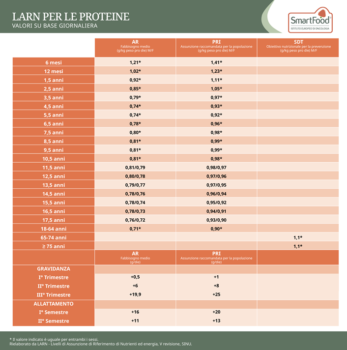 I LARN per le proteine, ossia i livelli di assunzione di riferimento per la popolazione italiana stabiliti dalla SINU, sono definiti a partire dal fabbisogno proteico minimo inteso come la più bassa assunzione di proteine con gli alimenti, in grado di garantire il mantenimento della quota proteica dell’organismo in presenza di adeguati apporti di energia, di una normale composizione corporea e di un appropriato livello di attività fisica.