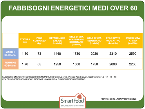Osservando i fabbisogni energetici medi in età adulta e negli over 60, nelle tabelle di seguito, si nota come la diminuzione dei valori del metabolismo, determini una riduzione del dispendio energetico totale. La differenza tra uomo e donna, a parità di peso e altezza, è sempre determinata da una differente composizione corporea, generalmente l’uomo, infatti, ha una quota maggiore di massa muscolare.