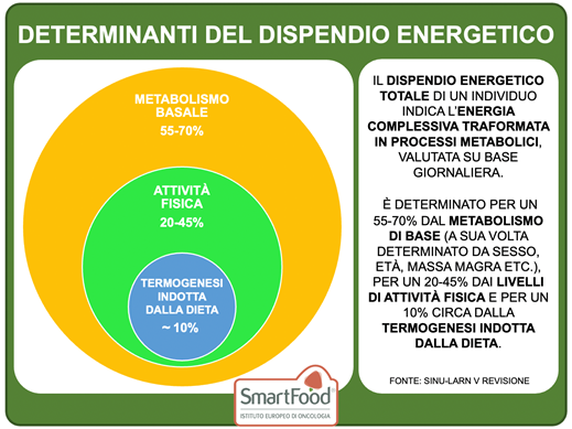 Il dispendio energetico corrisponde all’energia utilizzata quotidianamente da un individuo, e, come intuibile, varia in base ai livelli di attività fisica di quel soggetto. La quota dedicata al movimento incide in maniera variabile, in genere è pari al 20-45% sul totale del dispendio energetico. C’è poi l’effetto termogenico degli alimenti, ossia l’energia spesa dall’organismo per la digestione degli alimenti, che dipende dalla loro composizione in nutrienti e impatta per un 10% circa. Mentre la quota più importante del dispendio energetico è determinata dal metabolismo basale e corrisponde al 55-70%. In alcuni casi, in cui l’organismo necessita di un surplus energetico, il dispendio aumenta, come ad esempio durante la crescita, la gravidanza e l’allattamento.