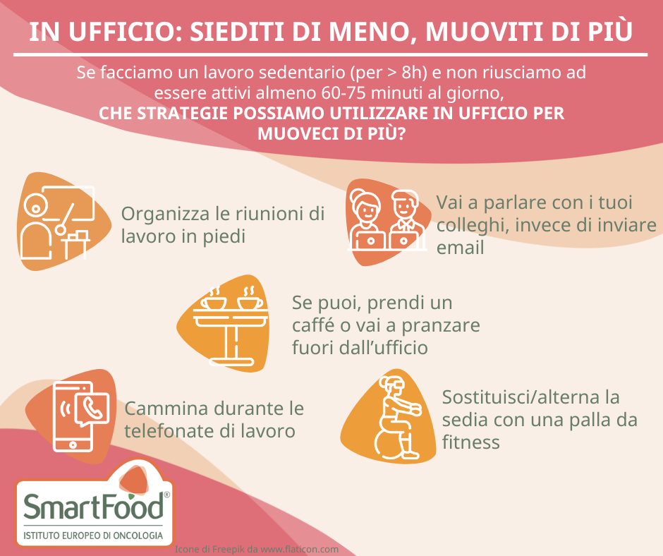 Abbandonare uno stile di vita sedentario, non significa necessariamente passare 2 ore al giorno, tutti i giorni, in una palestra. Sicuramente praticare regolarmente sport è un’ottima soluzione, ma è anche importante cercare di muoversi di più in ogni momento della giornata, se possibile anche in ufficio.