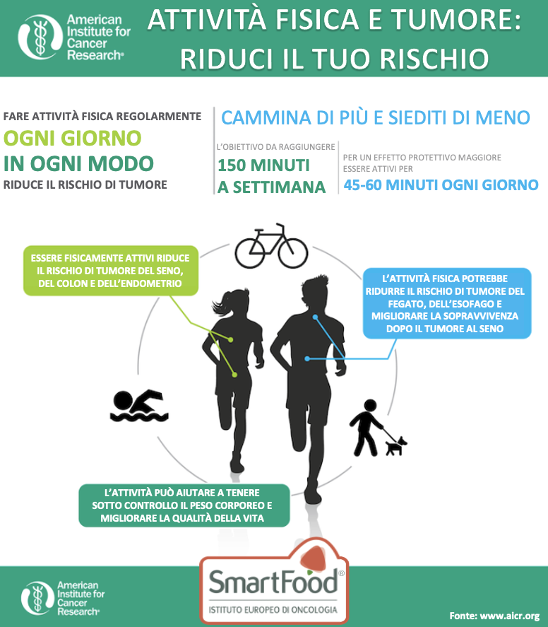 - Diversi studi epidemiologici sono riusciti a dimostrare l’utilità dell’attività fisica anche nella prevenzione dell’insorgenza di particolari tumori. I dati più solidi, riportati dal Fondo Mondiale per la Ricerca sul Cancro (Word Cancer Research Fund, WCRF) sono quelli relativi a tre tipologie di patologie oncologiche, le prime due molto frequenti nella popolazione: colon-retto, seno ed endometrio.