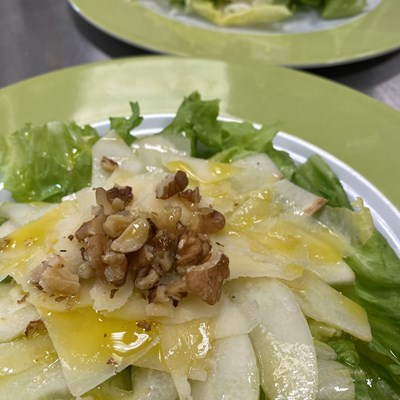 - A questo punto unite tutti gli ingredienti in una grande ciotola: il crauto rosso, lo spinacino, le listarelle di carote, i cubetti di sedano, le fettine di mela, e condite con la citronette. Infine aggiungete le noci e i semi e mescolate per bene.
