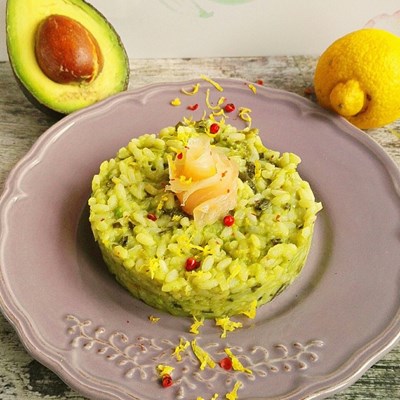 - Con l’aiuto di un coppapasta disporre su un piatto la crema di avocado, poi il riso saltato e infine i cubetti di pollo.